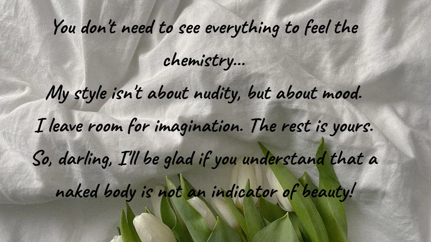 Hello, dear stranger! The only thing I want to say. I am not a nude model at all! I will be glad to discuss anything with you! I will be glad to open up to you and discover something new! But please have respect for my broadcast style and do not cross the line!