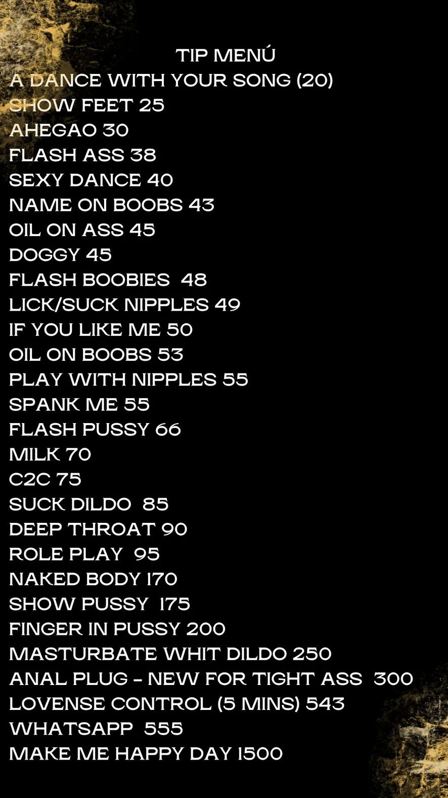 Doggy Style, Oil Show, Erotic Dance, Fingering, Dildo or Vibrator, Dirty Talk, Striptease, Smoking, Deepthroat, Sex Toys, Maduras, Blowjob, Twerk, Masturbation, Shower, Facesitting, Foot Fetish, Flashing, Jerk-off Instruction, Role Play, Orgasm, Hardcore, Baile, Ahegao, Anal, Spanking, Camel Toe, Upskirt, Topless, Gagging, Office, Anal Toys, Double Penetration, Handjob, Heels, Squirt